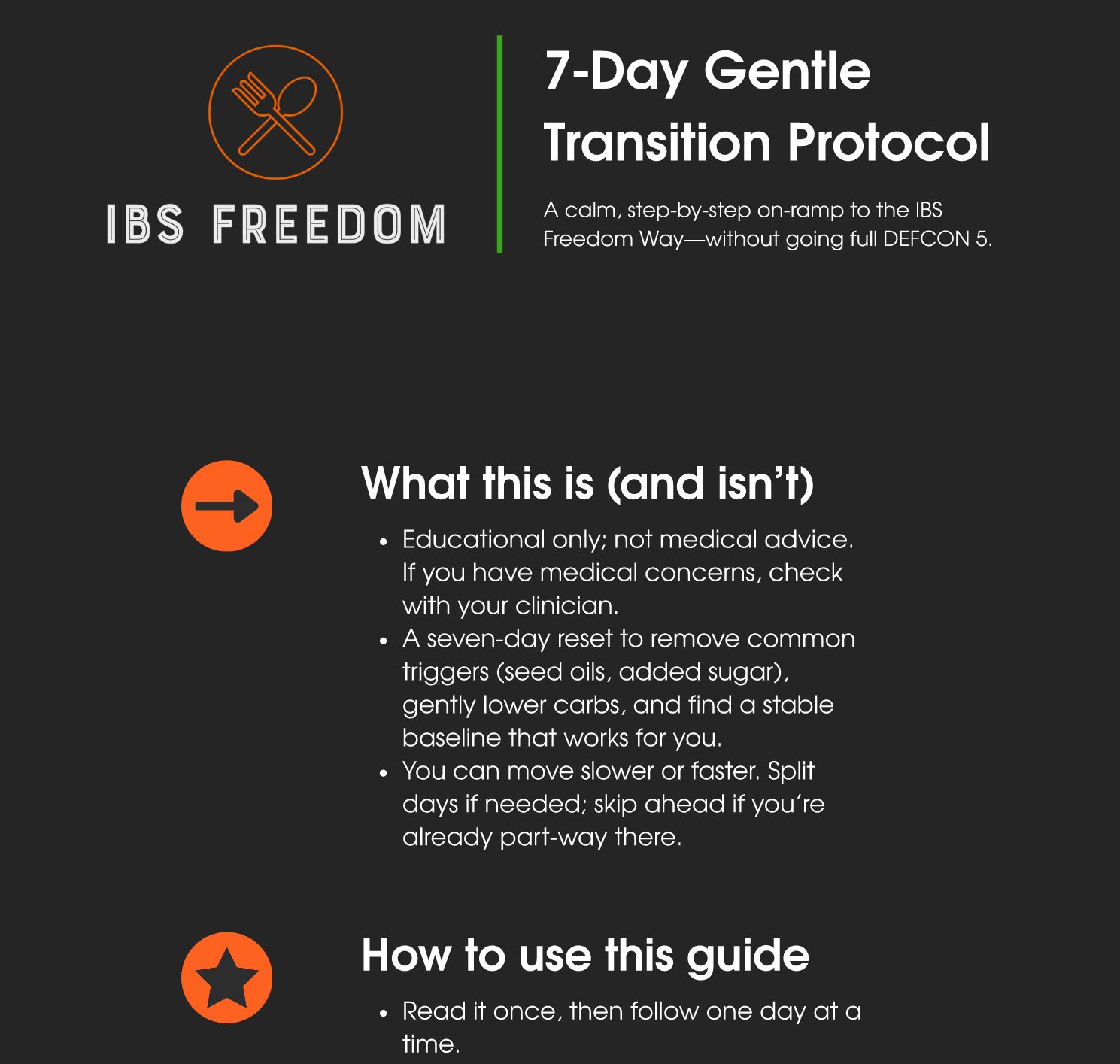 7 Day Gentle Transition Protocol The 7-Day Gentle Transition is exactly what it sounds like: a step-down guide to ease you into gut relief without a shock to your system.